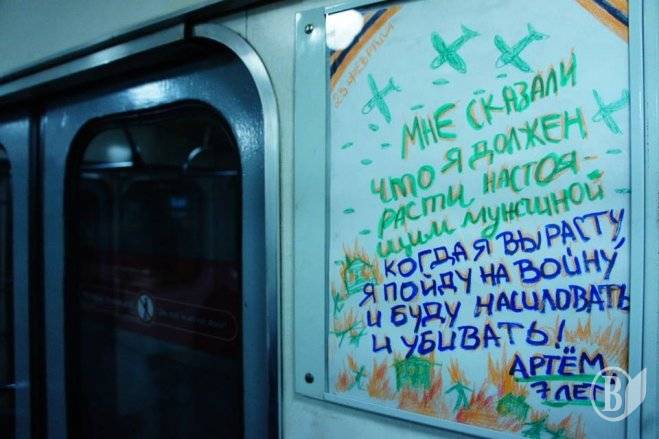 Різнокольоровими олівцями невідомі написали слова від імені дітей військових. Слова, що написані у вагонах метро, символізують усю жорстокість і неправильність війни та передають проблеми, які загрожують сім'ям солдатів, повідомляє Телеканал новин "24".
