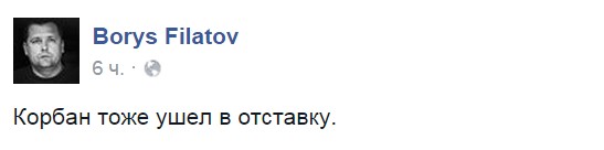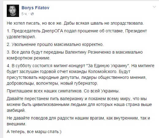 Про це на власній сторінці у Facebook повідомив народний депутат України, колишній заступник голови Дніпропетровської ОДА Борис Філатов.