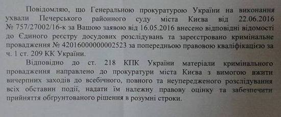 Генеральна прокуратура України на виконання ухвали Печерського районного суду міста Києва від 22 червня 2016 р. за заявою Валентина Наливайченка внесла відповідні відомості до Єдиного реєстру досудових розслідувань та зареєстровано кримінальне провадження за правовою кваліфікацією за ч.1 ст. 209 КК України.