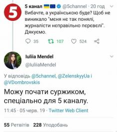 «… припустилася небаченого хамства у спілкуванні з журналістами. Мало того, що вона не забезпечила переклад промови виступу Президента державною мовою, так ще на прохання журналістів надати його вона відповіла, дослівно, "Можу почати суржиком, спеціально для 5 каналу", – нагадує Павло Славинський. – Нездатність організувати гідне представлення Президента для преси та прилюдне знущання з української мови однозначно вказують на професійну непридатність Юлії Мендель для роботи на такій відповідальній посаді. Вимагаємо негайно звільнити її та провести відкритий конкурс на вивільнену посаду, із визначеними критеріями відбору та гідною відбірковою комісією».