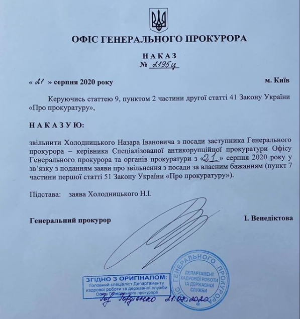 «Керуючись статтею 9, пунктом 2 частиною другою статті 41 закону України «Про прокуратуру», наказую: звільнити Холодницького Назара Івановича з посади заступника генерального прокурора - керівника Спеціалізованої антикорупційної прокуратури Офісу генерального прокурора та органів прокуратури 21 серпня 2020 року у зв'язку з поданням заяви про звільнення з посади за власним бажанням (пункт 7 частини першої статті 51 закону України «Про прокуратуру»).