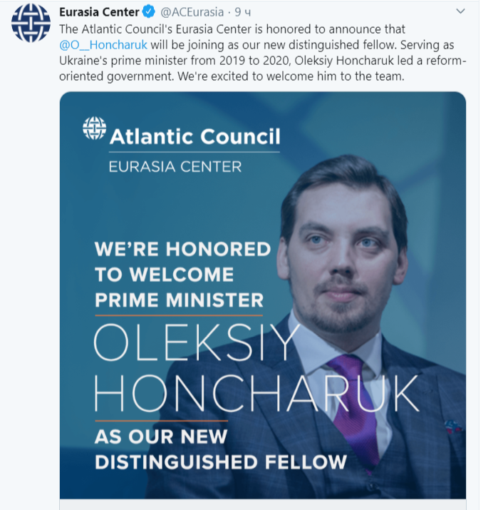"Центр Євразії Атлантичного має честь оголосити, що Олексій Гончарук приєднається до нас в якості нашого нового заслуженого співробітника. Будучи прем'єр-міністром України з 2019 по 2020 рік, Олексій Гончарук очолив уряд, орієнтований на реформи. Ми раді вітати його в команді", - йдеться в повідомленні.