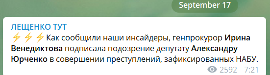"Як повідомили наші інсайдери, генпрокурор Ірина Венедіктова підписала підозру депутату Олександру Юрченку в скоєнні злочинів, зафіксованих НАБУ", – йдеться в повідомленні.