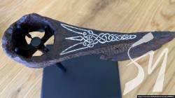 По боках нанесений скандинавський взір, вгорі намальований тризуб, а позаду зображено тотемну тварину – вовка, а це поширений тотем (предмет, істота), зокрема на Чернігівщині.