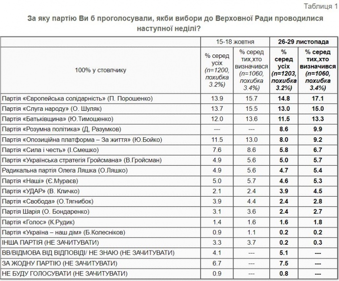 Далі йдуть такі партій та політичні проєкти: “Розумна політика” (8,6% і 9,9%), “ОПЗЖ” (8% і 9,2%), “Сила і честь” (5,8% і 6,7%), “Українська стратегія Гройсмана” (5% і 5,7%), РПЛ (4,7% і 5,4%), “Наші” (4,6% і 5,3%), “УДАР” (3,9% і 4,5%)”.