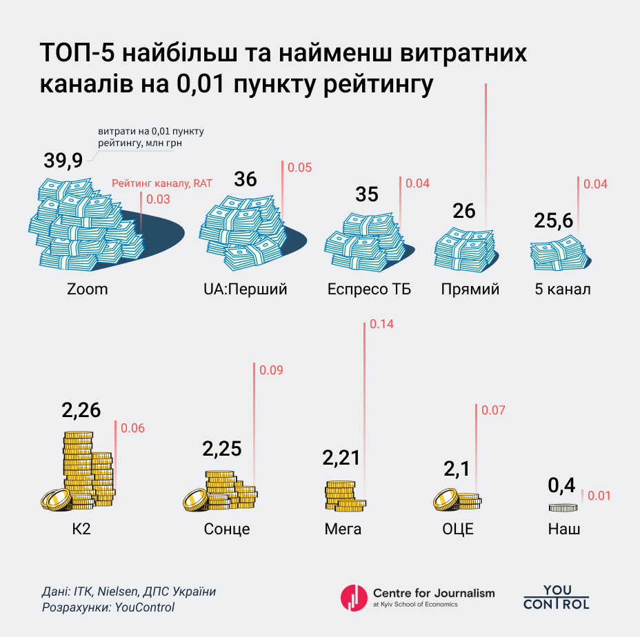 Індустріального телевізійного комітету від дослідницької компанії Nielsen вдалося порівняли ці витрати з усередненими рейтингами телеканалів за 10 місяців 2020 року. Таким чином, медіанне значення витрат на 0,01 пункту телевізійного рейтингу складає 10,2 млн грн, середнє