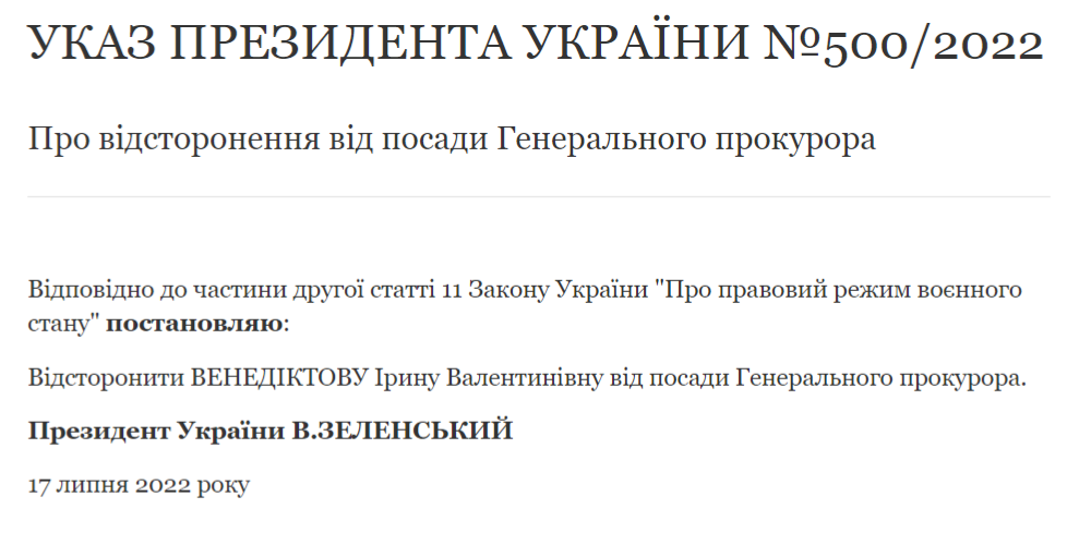 Так, Зеленський відсторонив Венедіктову і поклав обов'язки генерального прокурора на її заступника Олексій Симоненка.