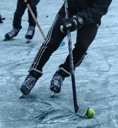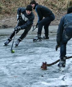 Пролітав мимо Красного мосту, аж гульк. Хлопці вже в хокей грають. Та не де-небудь, а на самісінькій річці. Ганяють собі, аж дух захоплює.