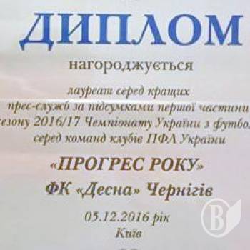 Професійна футбольна ліга нагородила дипломом ФК «Десна» і надала звання «Прогрес року».