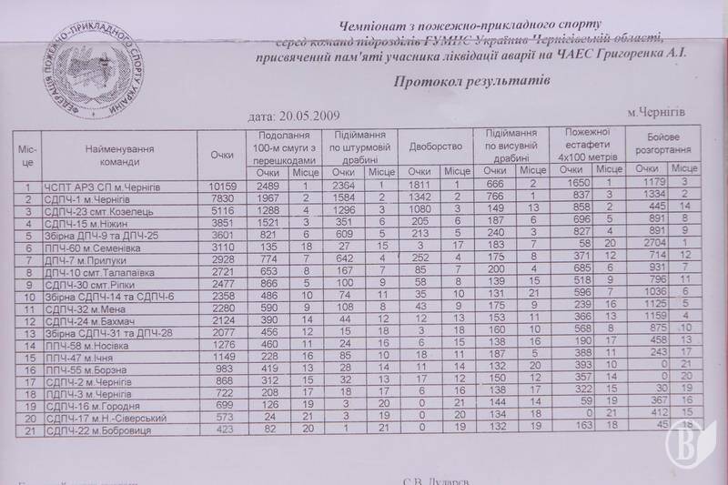 Перше місце і перехідний Кубок зайняла команда частини спеціальної техніки ЧСПТ АРЗ СП м. Чернігів, друге місце - СДПЧ- 1 (по охороні Деснянського р-на) і третє місце виборола команда СДПЧ -23 смт. Козелець.