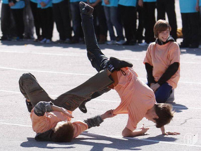 діти голими руками, ліктями і незахищеними головами лазять по затоптаному, запльованому, порепаному асфальту! Хоч би ці організатори-солдафони брезент постелили, якщо іншого немає. Була очевидцем цього дитячого шоу для унтер-пришибеєвих. Жахливе враження: діти перекидали одне одного через себе, головою до асфальту залишалося іноді 5 сантиметрів. А дорослі дебіли споглядали з трибун. Про права дитини вони, звісно, нічого не чули, а раптом би хтось поранився! Звісно, долоні й лікті вони поздирали...