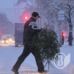 На фото: Мужчина несет елку по ул.А. Молодчего 29 декабря в 7 часов 50 мин.