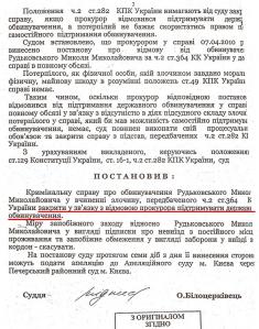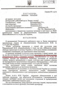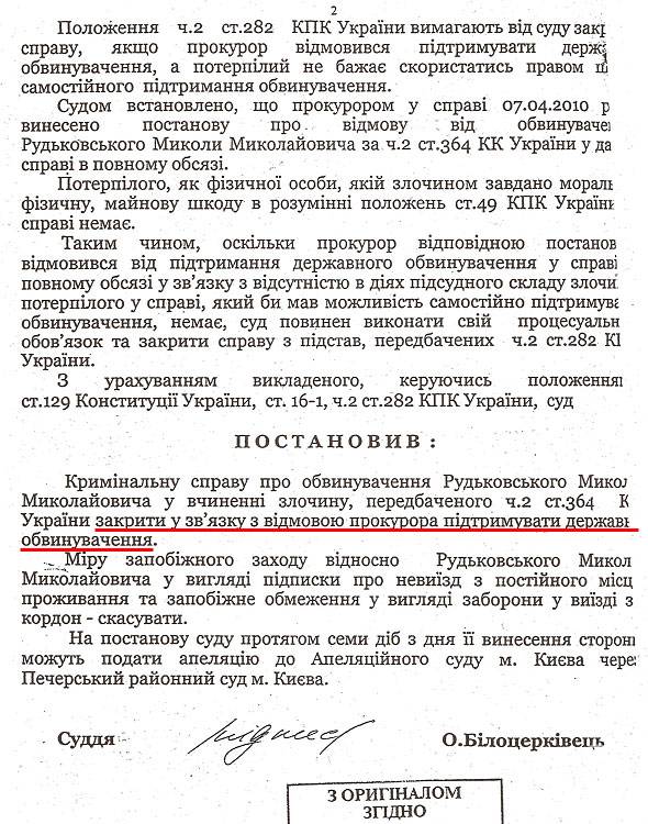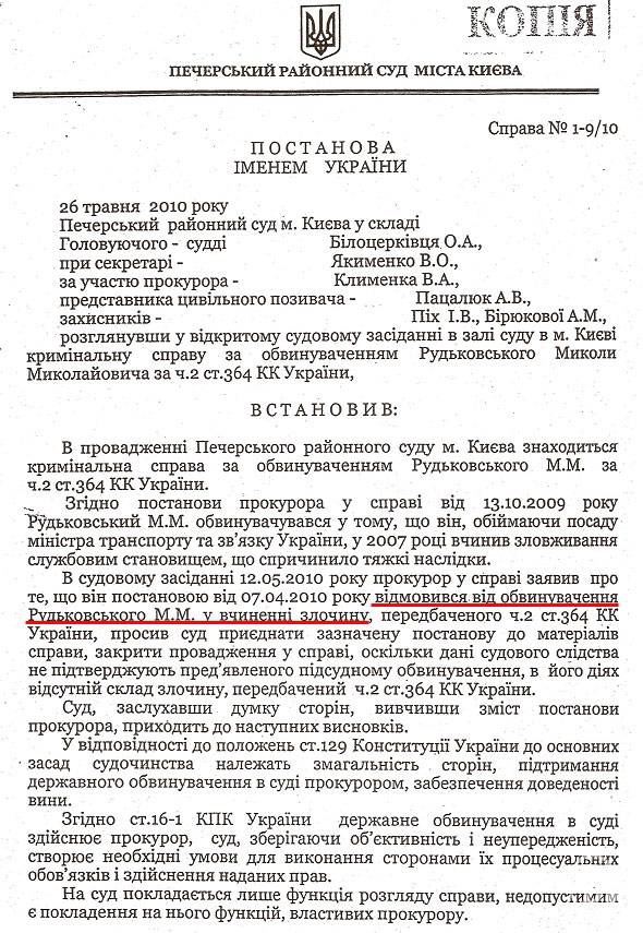 "В судовому засіданні 12.05.2010 року прокурор у справі заявив про те, що він постановою від 07.04.2010 року відмовився від обвинувачення Рудьковського у вчиненні злочину, передбаченого ч.2 ст.364 КК України, просив суд приєднати зазначену постанову до матеріалів справи, закрити провадження у справі, оскільки дані судового слідства не підтверджують пред'явленого підсудному обвинувачення, в його діях відсутній склад злочину, передбачений ч.2 ст.364 КК України", - ідеться у реабілітаційному для Рудьковського рішенні Печерського райсуду.