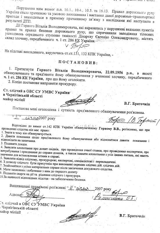 Четвертий слідчий в цій справі, незважаючи на те, що у всіх, без винятку автотехнічних експертизах, навіть у тій, що мене звинувачує і в обвинуваченні Дікарєва Є. державною мовою сказане: «Зіткнення сталося на заасфальтованому узбіччі дороги…», звинувачуючи мене, 31 січня 2007 року написав у постанові: «…не надав дорогу транспортному засобу, що рухався по рівнозначній дорозі в зустрічному напрямку, … внаслідок чого «Мерседес» Дікарєва Є., який рухався по рівнозначній дорозі в зустрічному напрямку скоїв зіткнення з автомобілем під керуванням Горного В.»