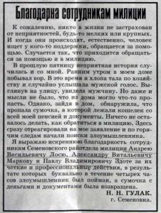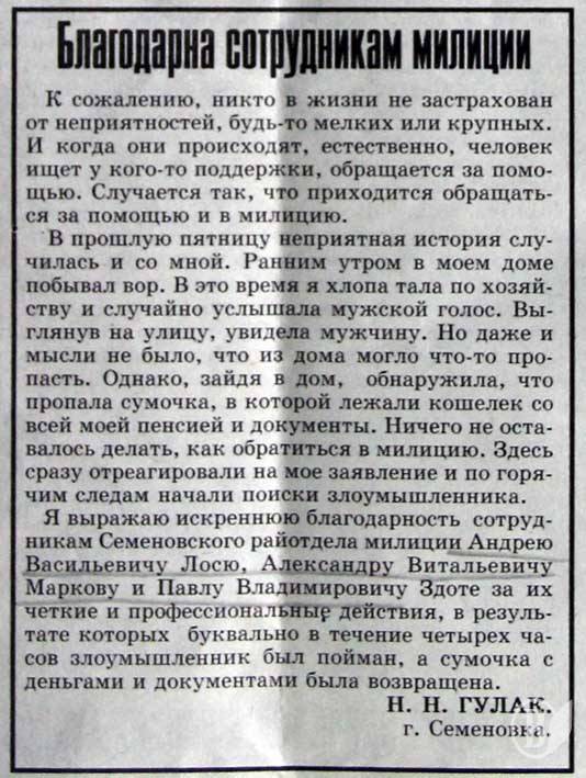 18-го липня в газеті «Життя Семенівщини» було опубліковано лист-подяку жительки Семенівки Ніни Гулак працівникам Семенівського райвідділу УМВС Андрію Лосю, Олександру Маркову та Павлу Здоті за оперативні і злагоджені дії по розкриттю крадіжки, жертвою якої стала авторка листа.