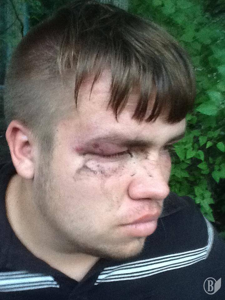 Здається мені, що чуваг по п'яні об двері тріснувся, а потім, щоб фінгал не "пропадав" даремно, розповідає про напад п'ятьох бандитів ©, котрі "били ногами по голові" ©, але влучили, як видно з фото, лише однією ногою один раз :)