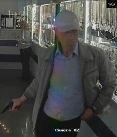 Грабіжник віком 45-55 років, зріст близько 1,76 м, худорлявий, озброєний предметом, схожим на пістолет.