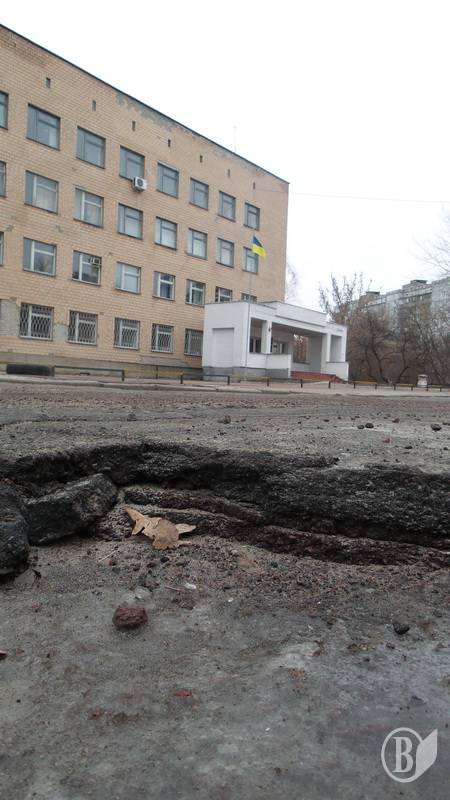 Вулиця Гетьмана Полуботка. Тут розташовані поряд військомат, національний педуніверситет і волонтерський центр. Величезну яму просто посеред дороги місцеві майстри на всі руки заклали цеглинами, бо її глибина почала не витримувати жодної критики. Ями об'їжджають, при цьому утворюється односторонній рух, адже водіям доводиться пропускати зустрічний транспорт.