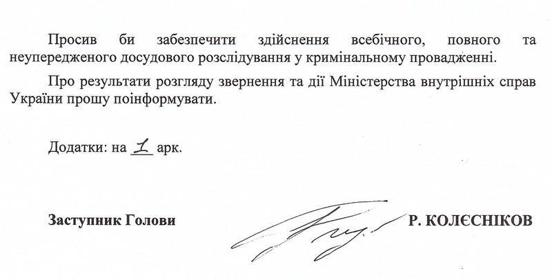 У листі Руслан Колєсніков зазначає про існування численних свідків цього нападу та наполягає на забезпеченні неупередженого та всебічного досудового розслідування справи.