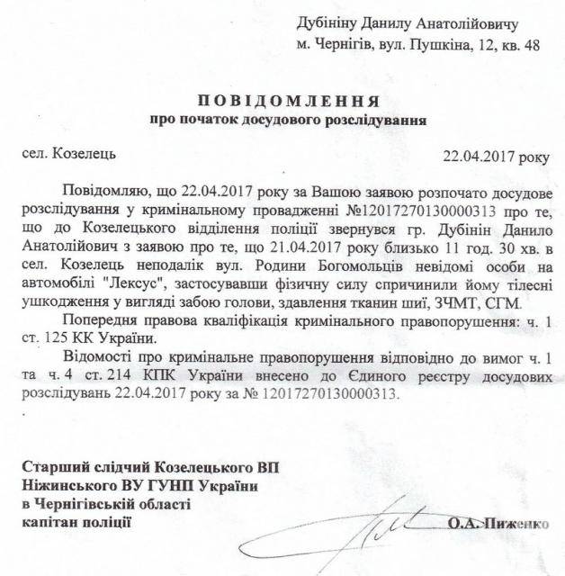 26.04.2017 Поліція побачила кримінал у побитті активіста в Козельці за участю колишнього міліціонера
