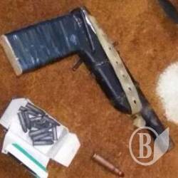 На додачу, як бачимо на фото, підозрюваний володів жахливим (принаймні, на вигляд) «самопалом» – це саморобний пристрій для стрільби бойовими патронами та набої до нього.