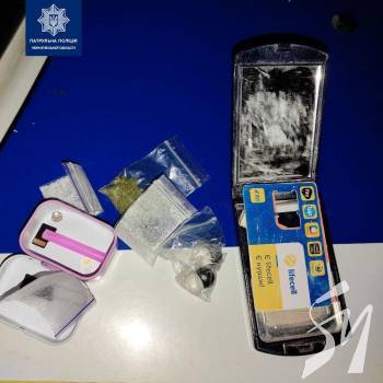Під час поверхневої перевірки інспектори виявили у громадянина чотири поліетиленових пакетики: три з білим порошком, один з подрібненою рослинною речовиною.