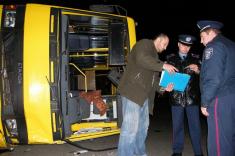 В результате ДТП автобус перевернулся на левый бок. Случилась утечка дизтоплива.
