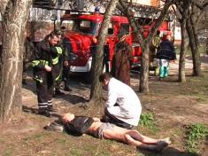 Второй подъезд дома был полностью заполнен дымом. Одев защитные противогазы, звено газодымозащитников поднялось на пятый этаж. Это начальник стражи, ст. лейтенант службы гражданской защиты Александр Кулида, старшие пожарные ст. сержант службы гражданской защиты Александр Тевкун и сержант службы гражданской защиты Геннадий Сыроед.
