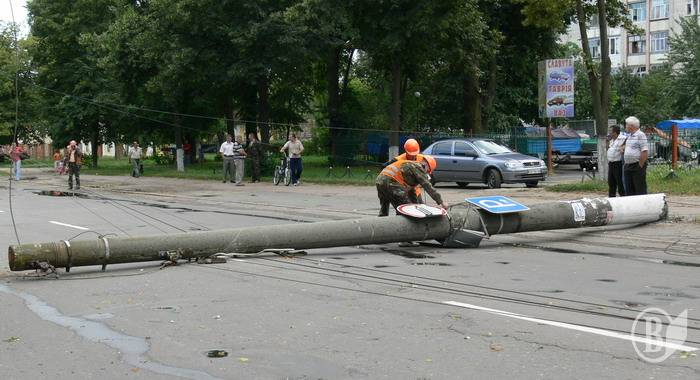 Околоо 16-и часов по Чернигову пронёсся буревал, который положил поперек проспекта Мира в областном центре дерево и опору троллейбусной линии.
