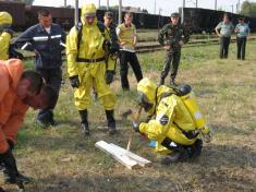 Отделение радиационно-химической и биологической защиты аварийно-спасательного отряда спецназначения ГУ МЧС и взвод аварийно-спасательных работ 8-го учебного центра госслужбы транспорта провели безотлагательные работы и в 15:00 устранили имеющееся вытекание кислоты.
