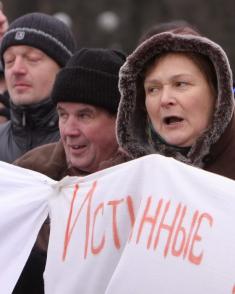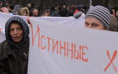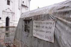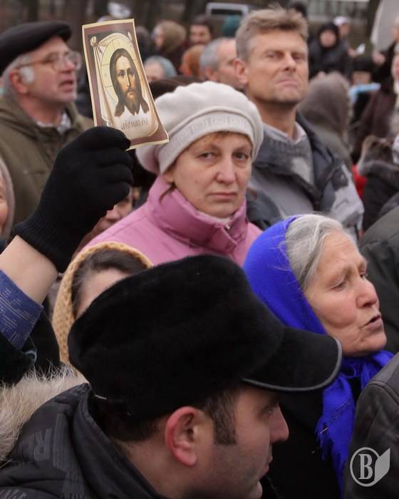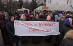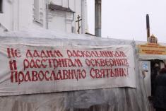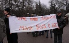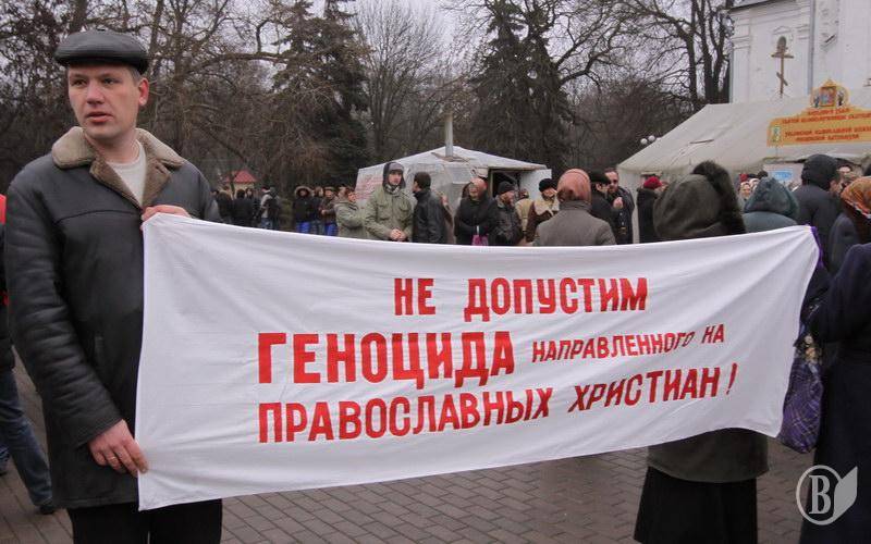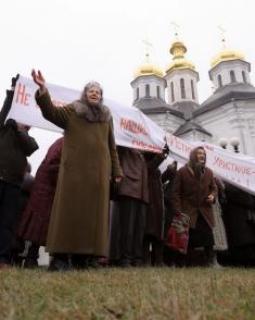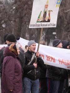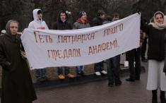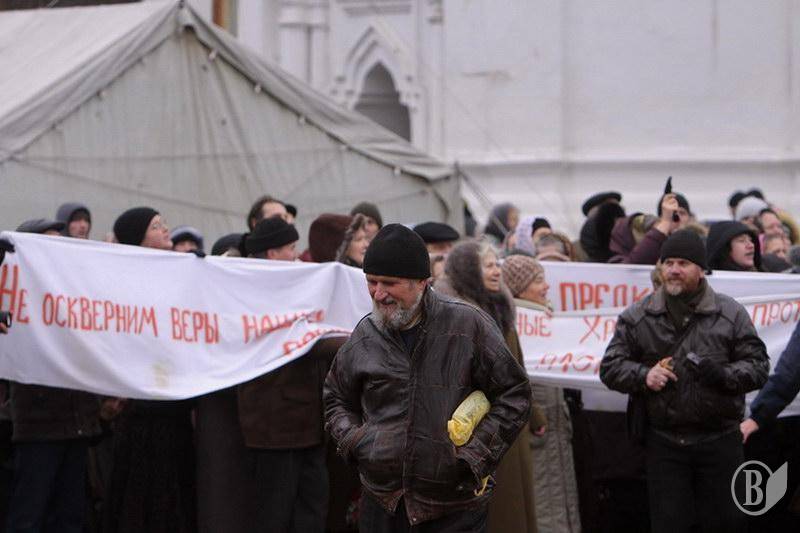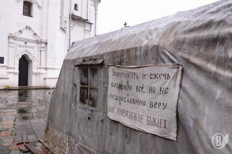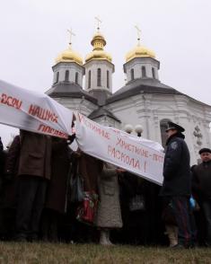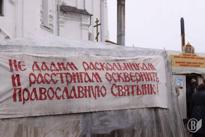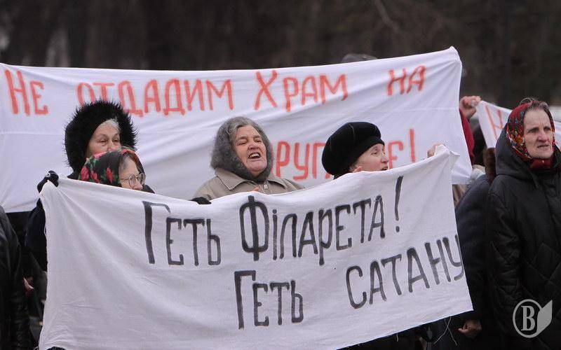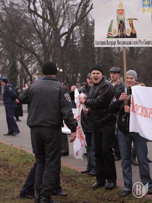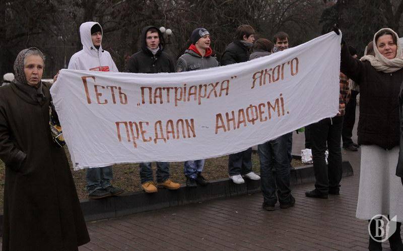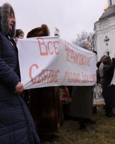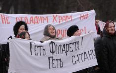Не забули агресивні віруючі й простирадла розгорнути з давно відомими чернігівцям лозунгами. Втім, спеціально до прибуття Патріарха Філарета намалювали і деякі нові, з лайкою на його адресу.