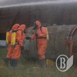 В специальных защитных костюмах специалисты группы радиационно-химического и биологического обеспечения ГУ МЧС провели разведку и спецавтомобилем обозначили зону, которая паддалась опасному химическому загрязнению.