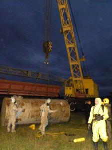 После ликвидации аварии поврежденную цистерну загрузили на платформу и транспортировали по железной дороге в безопасное место.