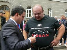 Мер Чернігова Олександр Соколов знайомить міського голову Гомеля з чернігівським силачем Олександром Пекановим