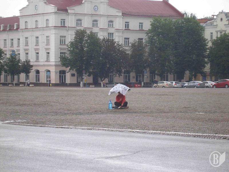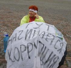 За пікетами під міською радою люди зовсім не помітили жінку, що сидить посеред площі. Біля неї надпис «Корупціонери», а на голові пов’язка «ГОЛОДАЮ».