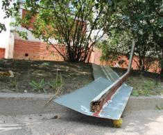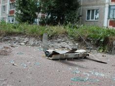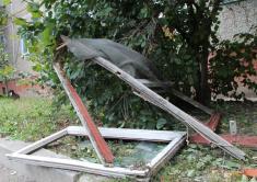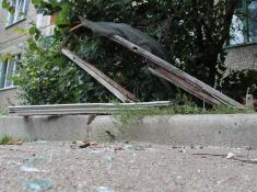 Картина на вулиці зараз спокійна. Тільки багато битого скла. Валяються розбита балконна рама, злив з балкону, телевізійна антена.
