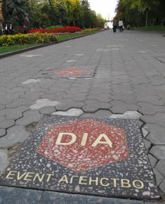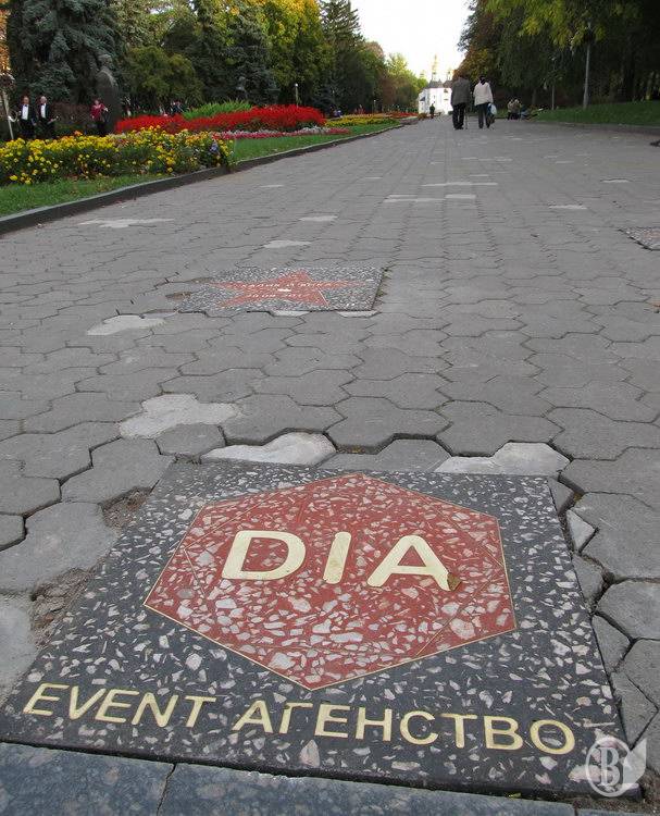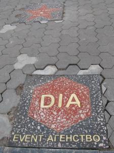 Особливо яскраві, навіть феєричні почуття викликає п'ята плита. Та, на якій не п'ятикутня зірка, а шестикутник з трьома літерами «DIA». Плита грубо врізана у тротуарну плитку, котра має зовсім не підходящу для вставки квадратних плит чудернацьку 12-кутну форму. Плита ще й вгрузла нижче рівня бруківки.