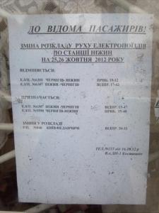 Зміна розкладу руху електропоїздів по станції Ніжин на 25, 26 жовтня 2012 року.
