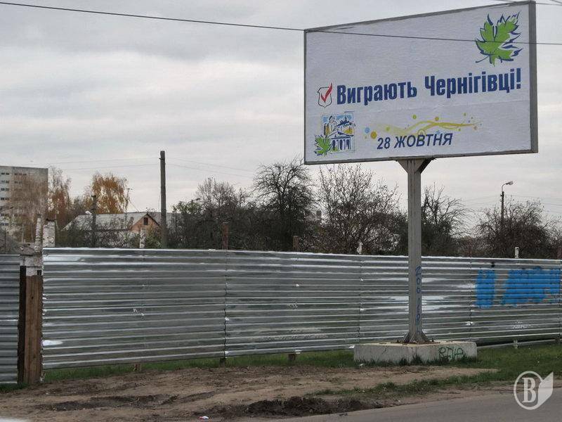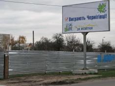 З особливим цинізмом над металевим парканом, що охопив чверть гектара зеленої травички, височіє бігборд кандидата в народні депутати Олександра Соколова. І доки вирували пристрасті, на ньому одне одного змінювали гасла: «Іду в парламент лобіювати інтереси чернігівців», «Виграють чернігівці» тощо.