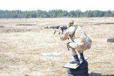 Військовослужбовці розвідувальної роти виконують вправи стрільб по трьом мішеням з підйомом та спуском по східцях, тренують рівновагу під час швидкісної тактичної стрільби, а також вправляються у стрільбі з різних положень правою та лівою рукою.