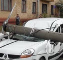 Для водія "Рено", що проїжджав у час, це стало несподіванкою. Електричний стовп впав на капот автомобіля.