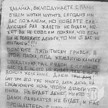 Валентине Каращук записка пришла еще три года тому назад. Она, в отличие от большинства получателей, не одинокая. Вместе с ней живет сын. На то время проживала дочка. Пока хозяйка лежала в больнице, дома никого не было, кто-то поджег ее поднавес с сеном, гараж, сгорел трактор. Через неделю в калитке торчало письмо: «Если хотите знать, кто вас сжег, положите тысячу долларов, только не заявляйте в милицию».