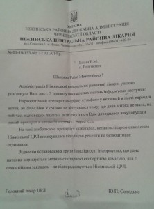 У відповіді головний лікар райлікарні пояснив, що на необхідні хворому препарати дійсно виписувались безкоштовні рецепти. А от отримати необхідні медпрепарати в ніжинській аптеці було неможливо, бо саме в той період аптека № 200 не мала відповідної ліцензії.
