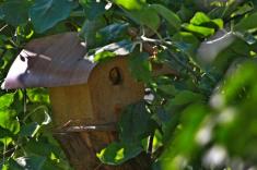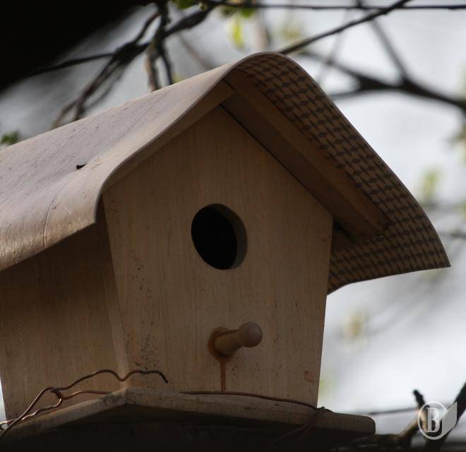 Дерев'яна хатинка для пташок була куплена маже два роки тому і встановлена на сухій обрізаній гілці яблуні.