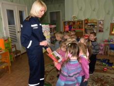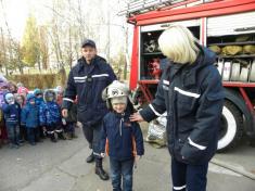 Цель визита - расширить и систематизировать знания детей о мерах безопасности в быту, на улице и сформировать у малышни элементарные навыки поведения в критических ситуациях. Сначала спасатели показали детям оснастки и роботу пожарного автомобиля, дали им померить свою боевую одежду и подержать в руках пожарно-спасательное вооружение.