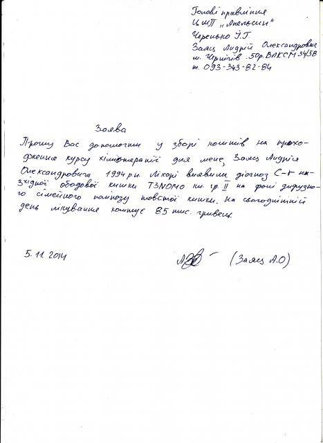 «Я не рідна мати Андрія. Зараз знаходжусь у декретній відпустці, а його батько працює електриком. У нас є ще маленька дитина. Доходи сім’ї не можуть нам дозволити оплатити лікування. Ми ледве-ледве змогли зібрати 30 000 гривень, які пішли на операцію. Де взяти кошти на курси хіміотерапії ми не знаємо, бо самі вже і так набрали боргів. Курс «хімії» ми повинні були почати кілька днів тому, але не зробили цього через відсутність грошей. На один курс потрібно 12 000 гривень. У Чернігівській міськраді нам пообіцяли дати 500 гривень, але тільки в кінці місяця. Зараз у нас надія тільки на звичайних людей. Тому я дуже прошу всіх, у кого є можливість, допомогти нам. Це наша остання надія», - розповідає мати Андрія, Марина Заяц.