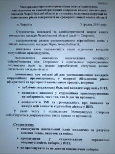 Меморандум про взаєморозуміння між студентством, викладачами та адміністративним апаратом вищих навчальних закладів Чернігівської області в питаннях подолання корупції та підвищення рівня відкритості та прозорості вищої освіти області