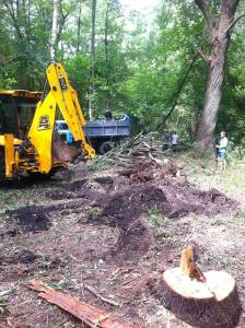 В частности, бульдозер выворачивает из земли пни. Срезанные деревья и пни сразу грузят на машину, отвозят, а территорию рочищають и выравнивают так, словно здесь ничего никогда не росло, - сообщают с места события.
