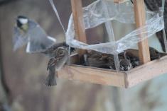 Синицы и воробьи через минуту отзываются на мое подсыпание семечек в кормушку. Они появляются неизвестно откуда и летят десятками.