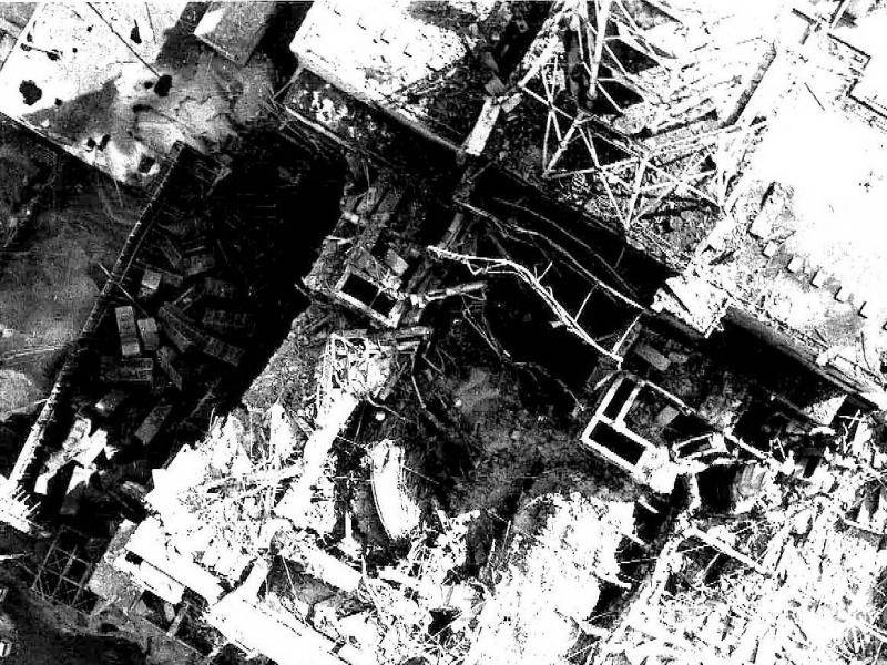 Фотоснимки, выполненные в первые дни после аварии на 4-ом энергоблоке Чернобыльской атомной электростанции, и после постройки объекта укрытия.
